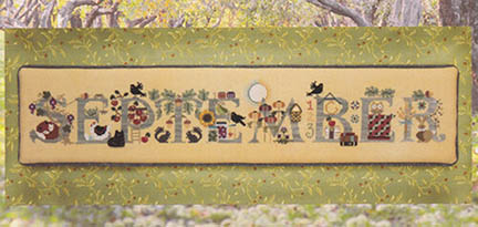 I finally found the perfect fabric for September from The Cricket Collection. It is called Pampas from Picture This Plus. I also changed the lettering to Weeks Dye Works Blue Spruce - you will need 4 skeiins if you like my model. Other than that - everything is what was called for on the pattern. I just love the look and it has been well received in our shop. The frame is a custome brown.