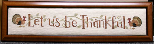 Usually I like to stitch holiday patterns either before or during - I was looking for something with a Thanksgiving theme and found this goodie from Bent Creek and loved the turkeys. I stitched the model on 28 Ct.Antique Ivory Cashel Linen (pattern called for 32 Ct. Linen, but I wanted it larger) using the recommeded floss, and framed in a custom gold/walnut frame,