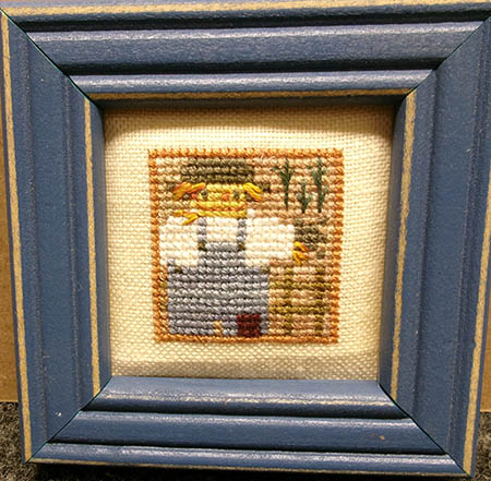 From the Littles series from Bent Creek comes this offerint - I was looking for something small, and this pattern fit the bill. I have done others in this series - they are fast. My model was done on 32 Ct. Antique Ivory Belfast Linen using the recommended floss - the frame is a 4x4 premade blue.